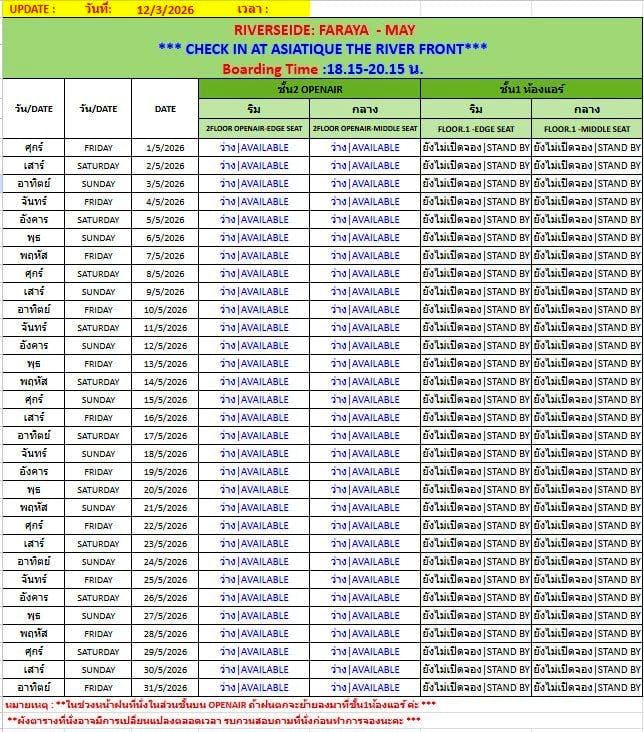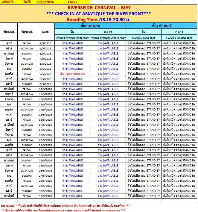 หมายเหตุ ตารางด้านล่าง ไม่อัพเดท Realtime จะอัพเดทเป็นวันต่อวัน หากต้องการ Confirm ที่นั่งรบกวนติดต่อเช็คกับทางเราอีกครั้ง
