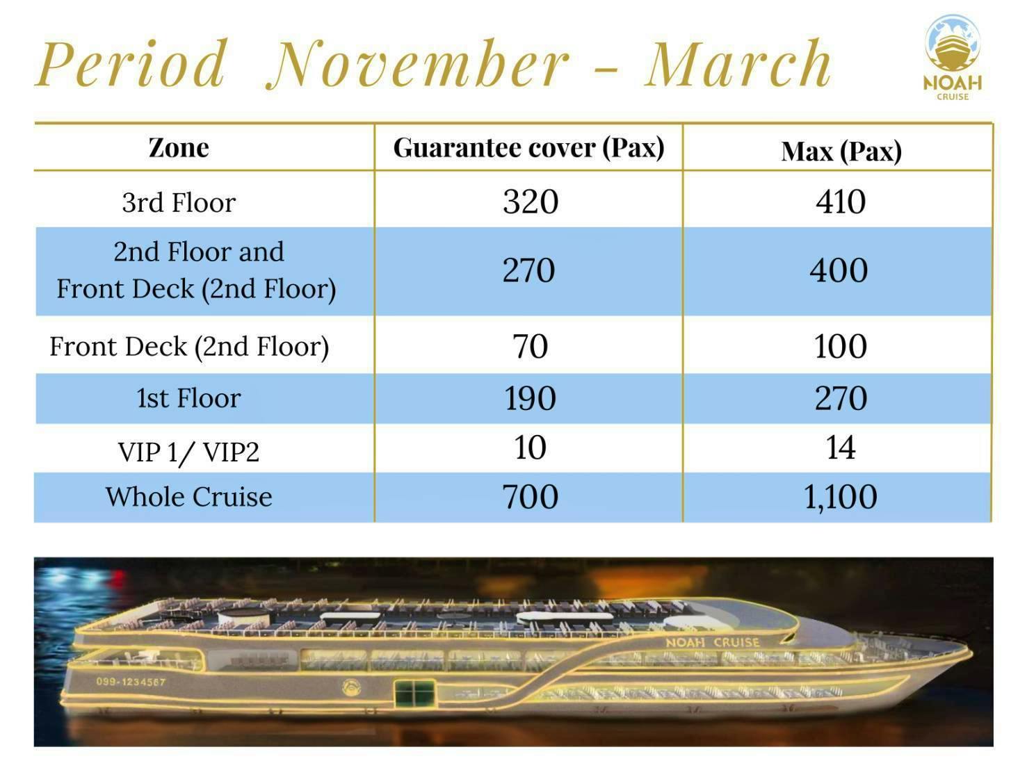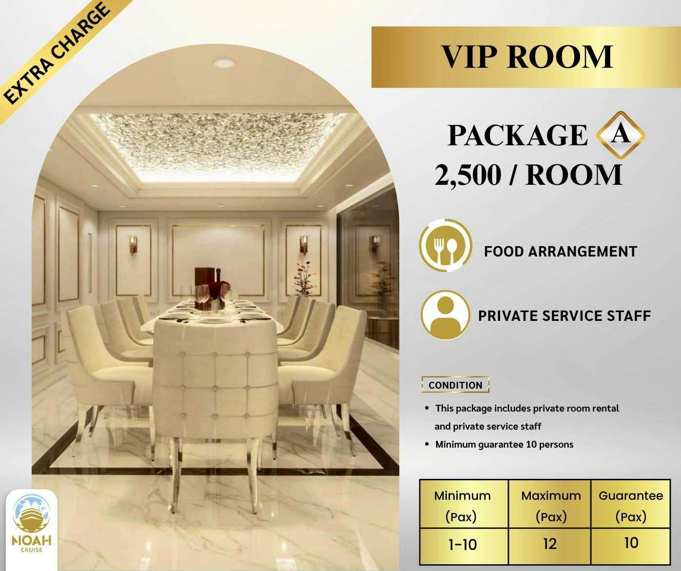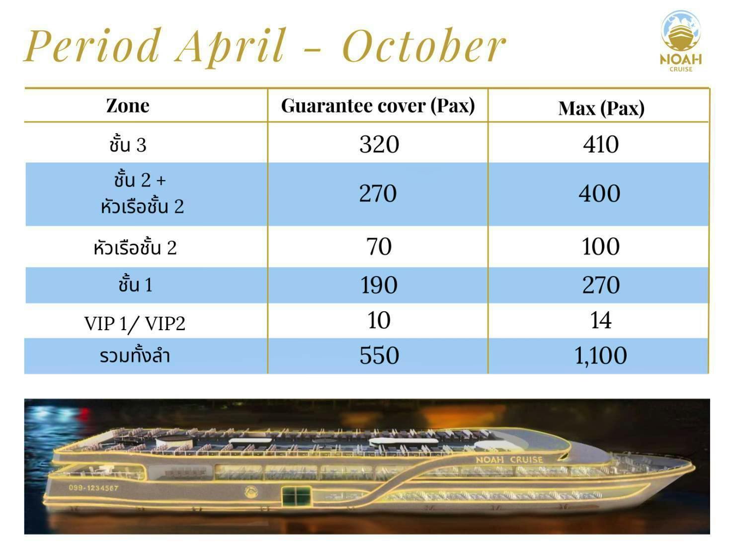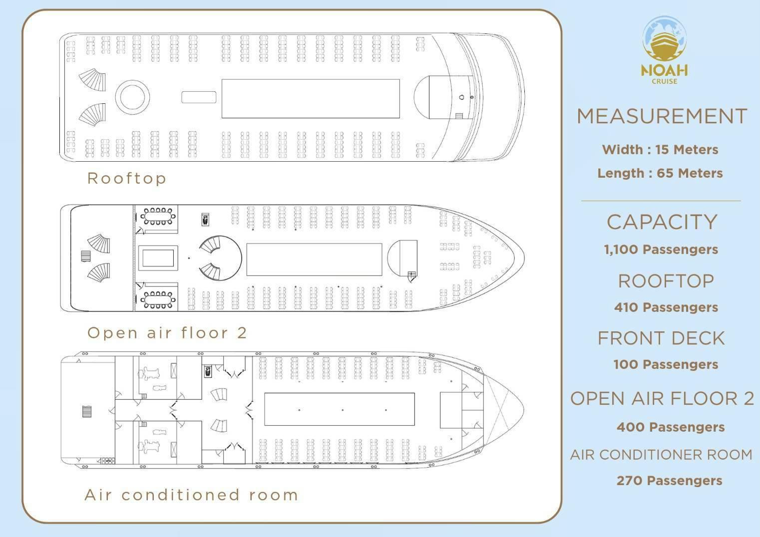 Noah เป็นเรือสำราญสำใหญ่ที่หรูหราและตระการตา ตกแต่งด้วยศิลปกรรมและระบบความปลอดภัยสูงสุด โดยชั้น 1 และชั้น 2 เป็นระบบปรับอากาศเย็นสบาย / ชั้น 2 หัวเรือ เปิดโล่ง /ดาดฟ้าชั้น 3 เปิดโล่งแบบ 360 องศา ให้ท่านได้รับลมชมวิวทิวทัศน์ของสองฝั่งลำน้ำเจ้าพระยาค่ำคืนที่สวยงามตระการตา สามารถรองรับผู้โดยสารได้ 1000 ท่าน