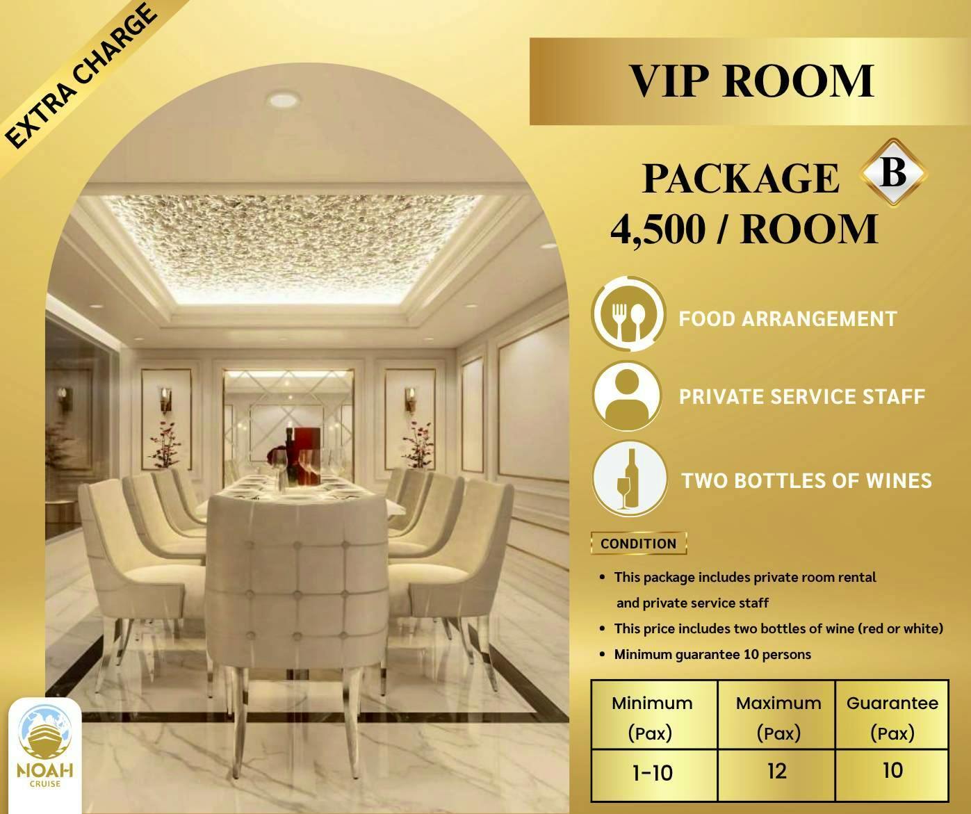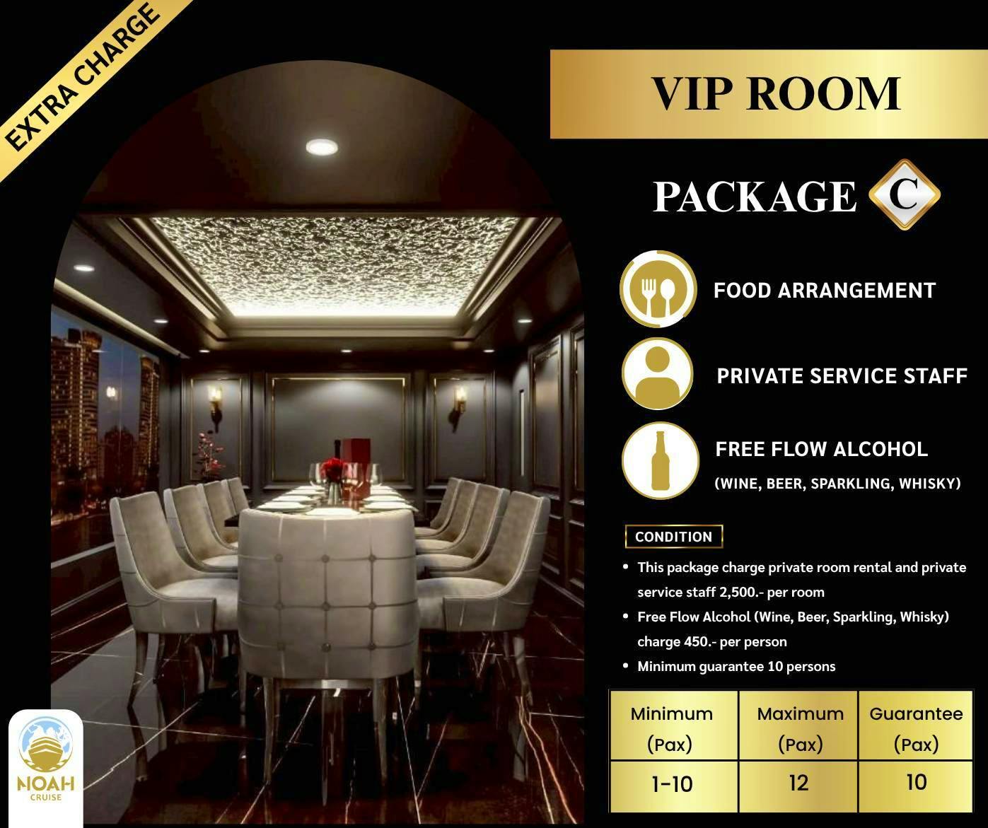 สัมผัสประสบการณ์สุดพิเศษกับการล่องเรือสำราญสุดหรู Noah ในบรรยากาศค่ำคืนบนลำน้ำเจ้าพระยา ที่แสนงดงามประดุจเมืองฟ้าอมร เป็นการพักผ่อนในค่ำคืนอันน่าจดจำตลอด 2 ชั่วโมง ดื่มด่ำกับบรรยากาศอันแสนพิเศษ พร้อมทั้งอิ่มอร่อยกับอาหารบุฟเฟ่ต์นานาชาติ และ อาหารทะเล (Sea Food) แบบจัดเต็มไม่อั้น ที่จะทำให้คืนพิเศษของคุณและคนรู้ใจ เป็นคำคืนที่แสนน่าจดจำ