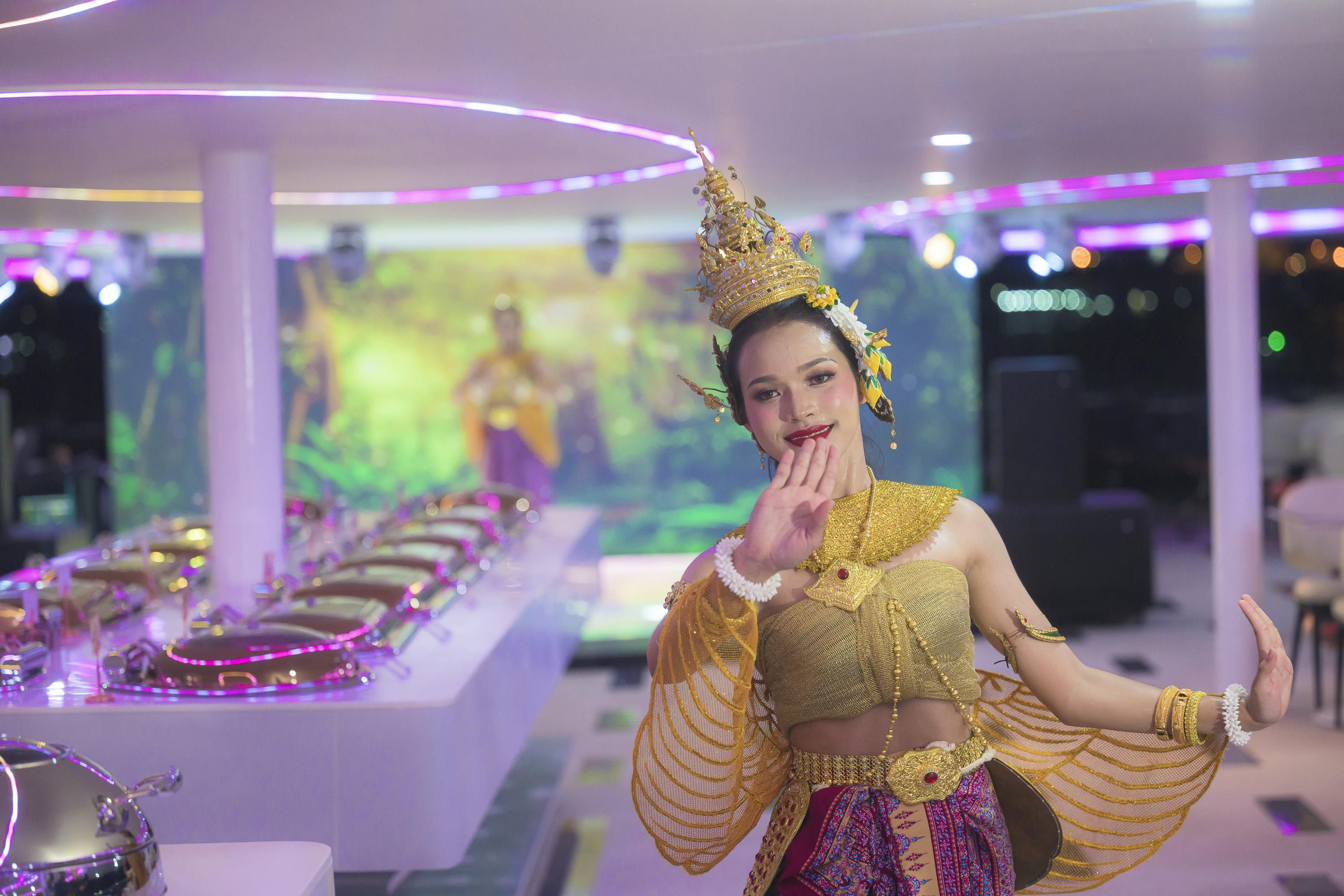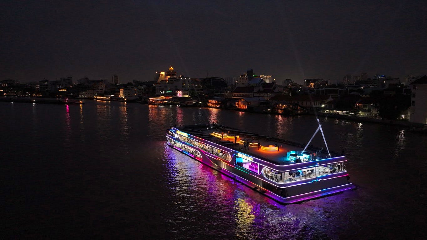 | 19.00 | เรือออกจากท่าไอคอนสยาม ท่านจะได้สัมผัสช่วงเวลาที่สุดพิเศษประทับการล่องเรือ พร้อม รับชมบรรยากาศตลอดแม่น้ำเจ้าพระยา จากทัศนียภาพบนเรือที่ยิ่งใหญ่ สำคัญทางประวัติศาสตร์ และ วิวธรรมชาติริมสองฝั่งแม่น้ำเจ้าพระยาทำการตกแต่งประดับประดาด้วยไฟหล้า อาทิเช่น วัดกัลยาณมิตร, วัดอรุณราชวราราม, วัดพระแก้ว, พระบรมมหาราชวัง, สะพานพระราม 8 รับประทานอาหารค่ำบนบุฟเฟต์เพื่อหาทานาบนดาดฟ้าพร้อมอาหารทะเลกุ้งแม่น้ำและหอยเชลล์ หอยชิลี อิ่มอร่อยกับแซลมอน และซาซิมิ คลอเคล้า ด้วยเสียงดนตรีอันไพเราะทั้งเพลงไทย และสากล ดื่มด่ำกับเครื่องดื่มอันหลลากหลลาย ที่เตรียมไว้บริการขายตลอดการล่องเรือสัมผัสบรรยากาศสดชื่นที่ชั้นดาดฟ้าของเรือ และ สนุกสนานไปกับการแสดงนาฎศิลลป์ของไทย พร้อมอิ่มเอมไปกับเสียงเพลงจากการแสดงดนตรีสด พร้อมนักร้องมืออาชีพ |