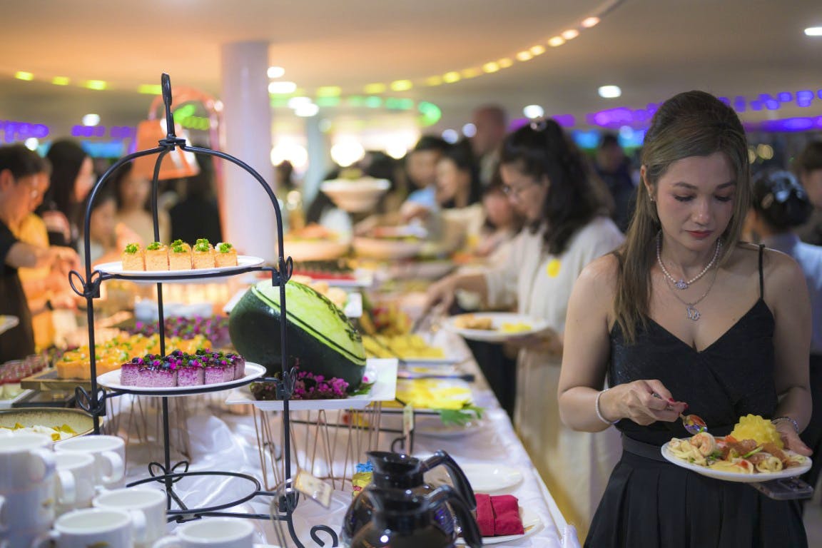 🍽️ อาหารส่วนมากเป็นบุฟเฟ่ต์ไทย-นานาชาติ ซีฟู้ด (กุ้ง หอยแมลงภู่ แซลมอนซาซิมิ) ยกเว้นรอบ Sunset บางรอบจะไม่มีซีฟู้ดค่ะ